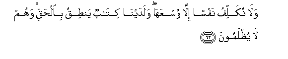 62. Wala nukallifu nafsan illa wusAAaha waladayna kitabun yantiqu bialhaqqi wahum la yuthlamoona