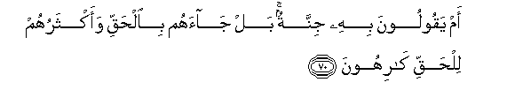 70. Am yaqooloona bihi jinnatun bal jaahum bialhaqqi waaktharuhum lilhaqqi karihoona