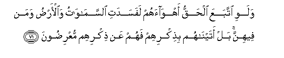 71. Walawi ittabaAAa alhaqqu ahwaahum lafasadati alssamawatu waal-ardu waman feehinna bal ataynahum bithikrihim fahum AAan thikrihim muAAridoona