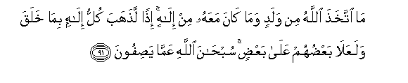 91. Ma ittakhatha Allahu min waladin wama kana maAAahu min ilahin ithan lathahaba kullu ilahin bima khalaqa walaAAala baAAduhum AAala baAAdin subhana Allahi AAamma yasifoona