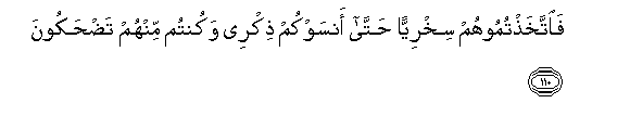 110. Faittakhathtumoohum sikhriyyan hatta ansawkum thikree wakuntum minhum tadhakoona
