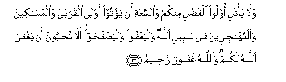 22. Wala ya/tali oloo alfadli minkum waalssaAAati an yu/too olee alqurba waalmasakeena waalmuhajireena fee sabeeli Allahi walyaAAfoo walyasfahoo ala tuhibboona an yaghfira Allahu lakum waAllahu ghafoorun raheemun