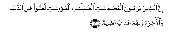 23. Inna allatheena yarmoona almuhsanati alghafilati almu/minati luAAinoo fee alddunya waal-akhirati walahum AAathabun AAatheemun