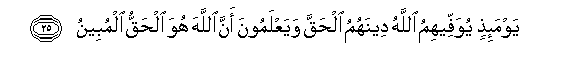 25. Yawma-ithin yuwaffeehimu Allahu deenahumu alhaqqa wayaAAlamoona anna Allaha huwa alhaqqu almubeenu