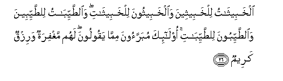 26. Alkhabeethatu lilkhabeetheena waalkhabeethoona lilkhabeethati waalttayyibatu lilttayyibeena waalttayyiboona lilttayyibati ola-ika mubarraoona mimma yaqooloona lahum maghfiratun warizqun kareemun
