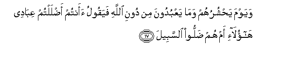 17. Wayawma yahshuruhum wama yaAAbudoona min dooni Allahi fayaqoolu aantum adlaltum AAibadee haola-i am hum dalloo alssabeela