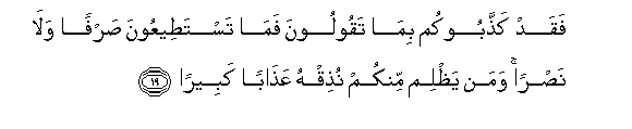 19. Faqad kaththabookum bima taqooloona fama tastateeAAoona sarfan wala nasran waman yathlim minkum nuthiqhu AAathaban kabeeran