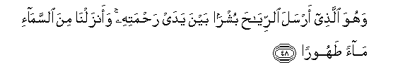 48. Wahuwa allathee arsala alrriyaha bushran bayna yaday rahmatihi waanzalna mina alssama-i maan tahooran