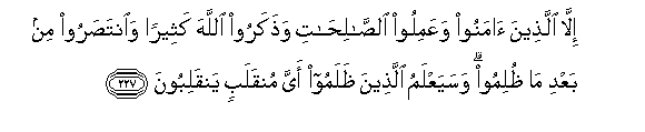 227. Illa allatheena amanoo waAAamiloo alssalihati wathakaroo Allaha katheeran waintasaroo min baAAdi ma thulimoo wasayaAAlamu allatheena thalamoo ayya munqalabin yanqaliboona