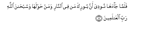 8. Falamma jaaha noodiya an boorika man fee alnnari waman hawlaha wasubhana Allahi rabbi alAAalameena