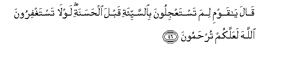 46. Qala ya qawmi lima tastaAAjiloona bialssayyi-ati qabla alhasanati lawla tastaghfiroona Allaha laAAallakum turhamoona