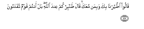 47. Qaloo ittayyarna bika wabiman maAAaka qala ta-irukum AAinda Allahi bal antum qawmun tuftanoona