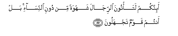 55. A-innakum lata/toona alrrijala shahwatan min dooni alnnisa-i bal antum qawmun tajhaloona