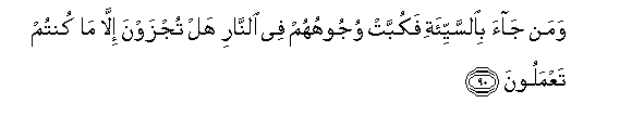 90. Waman jaa bialssayyi-ati fakubbat wujoohuhum fee alnnari hal tujzawna illa ma kuntum taAAmaloona