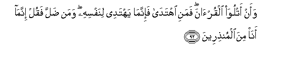 92. Waan atluwa alqur-ana famani ihtada fa-innama yahtadee linafsihi waman dalla faqul innama ana mina almunthireena