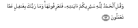 93. Waquli alhamdu lillahi sayureekum ayatihi fataAArifoonaha wama rabbuka bighafilin AAamma taAAmaloona