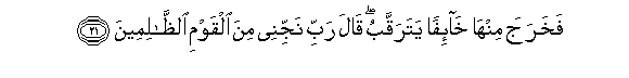 21. Fakharaja minha kha-ifan yataraqqabu qala rabbi najjinee mina alqawmi alththalimeena