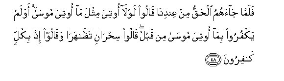 48. Falamma jaahumu alhaqqu min AAindina qaloo lawla ootiya mithla ma ootiya moosa awa lam yakfuroo bima ootiya moosa min qablu qaloo sihrani tathahara waqaloo inna bikullin kafiroona