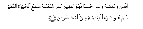 61. Afaman waAAadnahu waAAdan hasanan fahuwa laqeehi kaman mattaAAnahu mataAAa alhayati alddunya thumma huwa yawma alqiyamati mina almuhdareena