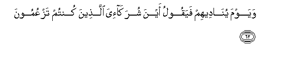 62. Wayawma yunadeehim fayaqoolu ayna shuraka-iya allatheena kuntum tazAAumoona