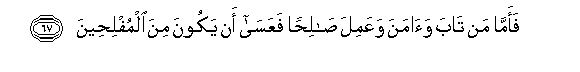 67. Faamma man taba waamana waAAamila salihan faAAasa an yakoona mina almufliheena