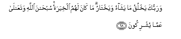 68. Warabbuka yakhluqu ma yashao wayakhtaru ma kana lahumu alkhiyaratu subhana Allahi wataAAala AAamma yushrikoona