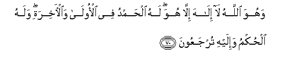 70. Wahuwa Allahu la ilaha illa huwa lahu alhamdu fee al-oola waal-akhirati walahu alhukmu wa-ilayhi turjaAAoona
