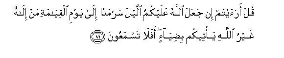 71. Qul araaytum in jaAAala Allahu AAalaykumu allayla sarmadan ila yawmi alqiyamati man ilahun ghayru Allahi ya/teekum bidiya-in afala tasmaAAoona