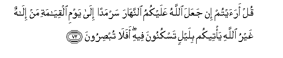 72. Qul araaytum in jaAAala Allahu AAalaykumu alnnahara sarmadan ila yawmi alqiyamati man ilahun ghayru Allahi ya/teekum bilaylin taskunoona feehi afala tubsiroona