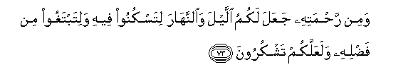 73. Wamin rahmatihi jaAAala lakumu allayla waalnnahara litaskunoo feehi walitabtaghoo min fadlihi walaAAallakum tashkuroona