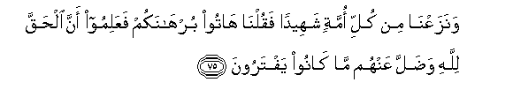 75. WanazaAAna min kulli ommatin shaheedan faqulna hatoo burhanakum faAAalimoo anna alhaqqa lillahi wadalla AAanhum ma kanoo yaftaroona