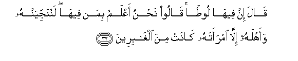 32. Qala inna feeha lootan qaloo nahnu aAAlamu biman feeha lanunajjiyannahu waahlahu illa imraatahu kanat mina alghabireena