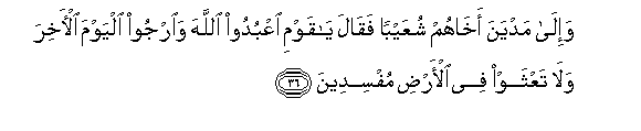 36. Wa-ila madyana akhahum shuAAayban faqala ya qawmi oAAbudoo Allaha waorjoo alyawma al-akhira wala taAAthaw fee al-ardi mufsideena
