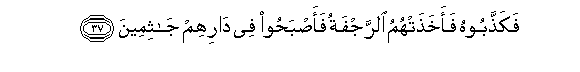 37. Fakaththaboohu faakhathat-humu alrrajfatu faasbahoo fee darihim jathimeena