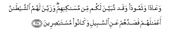 38. WaAAadan wathamooda waqad tabayyana lakum min masakinihim wazayyana lahumu alshshaytanu aAAmalahum fasaddahum AAani alssabeeli wakanoo mustabsireena