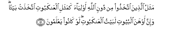 41. Mathalu allatheena ittakhathoo min dooni Allahi awliyaa kamathali alAAankabooti ittakhathat baytan wa-inna awhana albuyooti labaytu alAAankabooti law kanoo yaAAlamoona