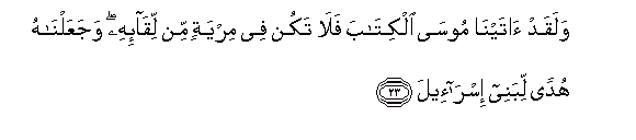 23. Walaqad atayna moosa alkitaba fala takun fee miryatin min liqa-ihi wajaAAalnahu hudan libanee isra-eela