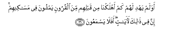 26. Awa lam yahdi lahum kam ahlakna min qablihim mina alqurooni yamshoona fee masakinihim inna fee thalika laayatin afala yasmaAAoona