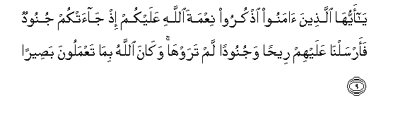 9. Ya ayyuha allatheena amanoo othkuroo niAAmata Allahi AAalaykum ith jaatkum junoodun faarsalna AAalayhim reehan wajunoodan lam tarawha wakana Allahu bima taAAmaloona baseeran