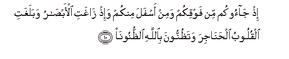 10. Ith jaookum min fawqikum wamin asfala minkum wa-ith zaghati al-absaru wabalaghati alquloobu alhanajira watathunnoona biAllahi alththunoona