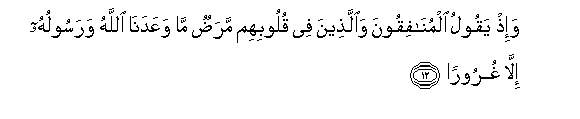 12. Wa-ith yaqoolu almunafiqoona waallatheena fee quloobihim maradun ma waAAadana Allahu warasooluhu illa ghurooran