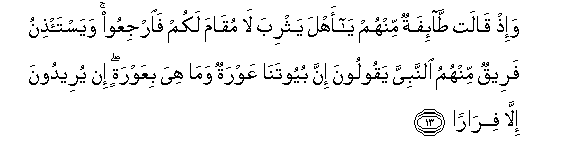 13. Wa-ith qalat ta-ifatun minhum ya ahla yathriba la muqama lakum fairjiAAoo wayasta/thinu fareequn minhumu alnnabiyya yaqooloona inna buyootana AAawratun wama hiya biAAawratin in yureedoona illa firaran