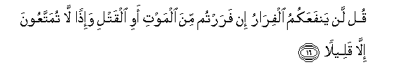 16. Qul lan yanfaAAakumu alfiraru in farartum mina almawti awi alqatli wa-ithan la tumattaAAoona illa qaleelan
