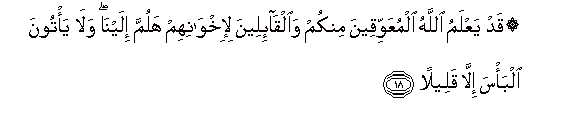 18. Qad yaAAlamu Allahu almuAAawwiqeena minkum waalqa-ileena li-ikhwanihim halumma ilayna wala ya/toona alba/sa illa qaleelan