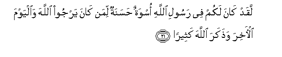 21. Laqad kana lakum fee rasooli Allahi oswatun hasanatun liman kana yarjoo Allaha waalyawma al-akhira wathakara Allaha katheeran