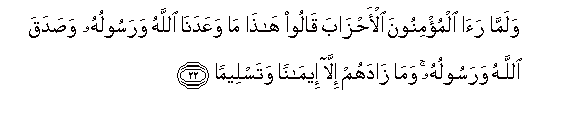 22. Walamma raa almu/minoona al-ahzaba qaloo hatha ma waAAadana Allahu warasooluhu wasadaqa Allahu warasooluhu wama zadahum illa eemanan watasleeman
