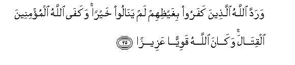 25. Waradda Allahu allatheena kafaroo bighaythihim lam yanaloo khayran wakafa Allahu almu/mineena alqitala wakana Allahu qawiyyan AAazeezan