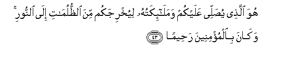 43. Huwa allathee yusallee AAalaykum wamala-ikatuhu liyukhrijakum mina alththulumati ila alnnoori wakana bialmu/mineena raheeman