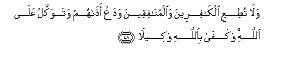 48. Wala tutiAAi alkafireena waalmunafiqeena wadaAA athahum watawakkal AAala Allahi wakafa biAllahi wakeelan