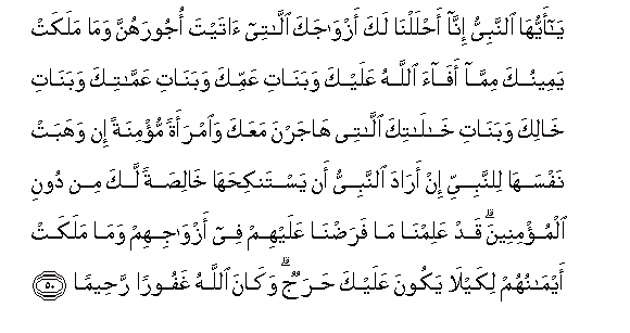 50. Ya ayyuha alnnabiyyu inna ahlalna laka azwajaka allatee atayta ojoorahunna wama malakat yameenuka mimma afaa Allahu AAalayka wabanati AAammika wabanati AAammatika wabanati khalika wabanati khalatika allatee hajarna maAAaka waimraatan mu/minatan in wahabat nafsaha lilnnabiyyi in arada alnnabiyyu an yastankihaha khalisatan laka min dooni almu/mineena qad AAalimna ma faradna AAalayhim fee azwajihim wama malakat aymanuhum likayla yakoona AAalayka harajun wakana Allahu ghafooran raheeman